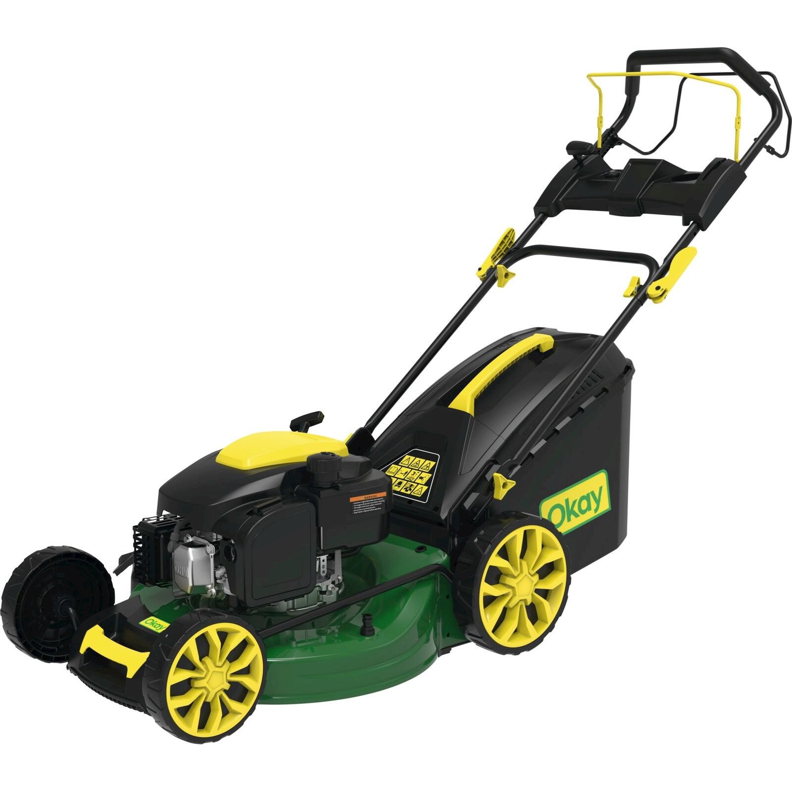 E-Start 6 PS Okay. High Wheeler mit stufenlos verstellbarem Radantrieb, Stahlgehäuse und 4-in-1 Funktion: Seitenauswurf, Mulchen, Heckfangsystem, Heckauswurf. Für Flächen bis 2000 m²