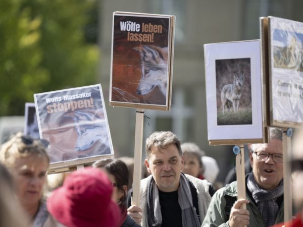 Auf dem Bundesplatz in Bern haben am Samstagnachmittag einige hundert Menschen gegen den Abschuss von Wölfen demonstriert. Sie forderten einen Stopp des „Wolfs-Massakers“.