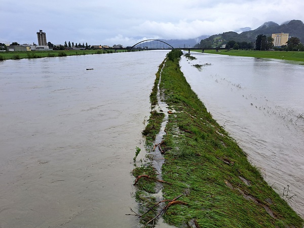 Mit den nachlassenden Niederschlägen entspannte sich auch die Hochwassersituation am Alpenrhein weiter. Ab dem Sonntag war – wie bei Hochwasser vorgesehen – das zwischen den beiden Aussendämmen gelegene Rheinvorland überflutet worden. Der maximale Wert bei der Abflussmenge von 2000 Kubikmetern pro Sekunde war im Alpenrhein bei Diepoldsau SG am Montagnachmittag gemessen worden. Danach sank der Wasserstand bereits wieder.