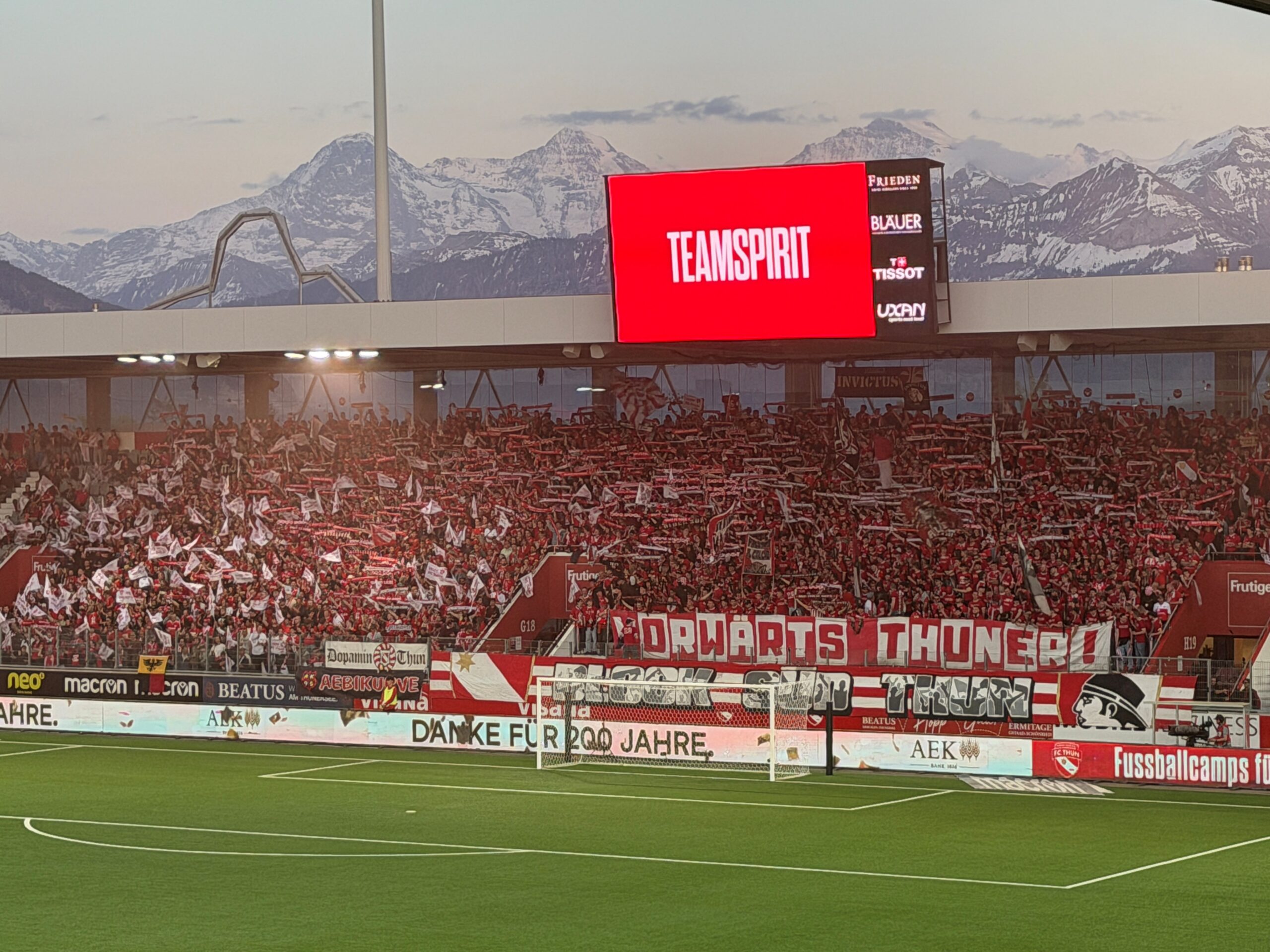 Der FC Thun verliert gegen Lugano nach einem Nackenschlag spät in der Nachspielzeit mit 0:1. Ein VAR-Elfmeter verwandelt von Ezgjan Alioski war das spielentscheidende Tor. Die herbeigesehnte Meisterparty muss also mindestens bis morgen Abend warten. Wenn dann St. Gallen auswärts bei YB nicht gewinnt, feiert Thun trotzdem – halt den Sofa-Meistertitel.